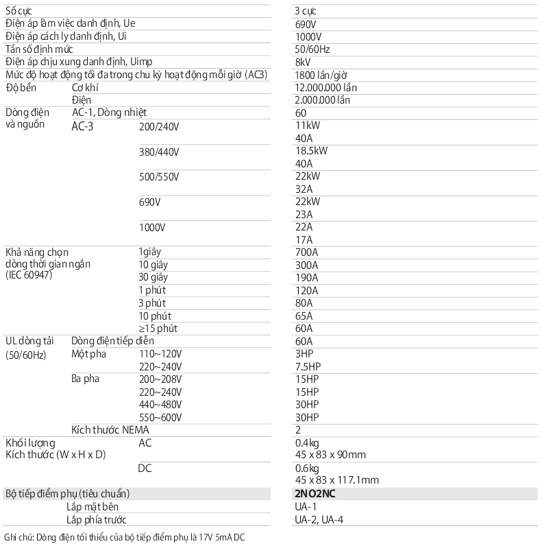 • Số cực: 3 cực • Điện áp cuộn: 220V • Dòng định mức: 40A • Bộ tiếp điểm phụ: 1NO1NC