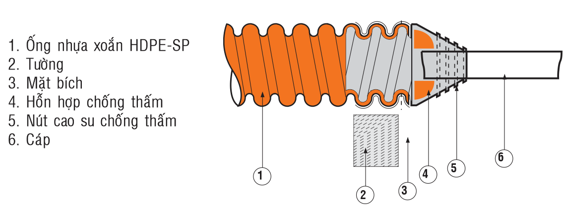 Dùng tại nơi ống nhựa xoắn HDPE-SP xuyên qua tường chắn để đảm bảo mĩ quan của hầm cáp hay công trình xây dựng